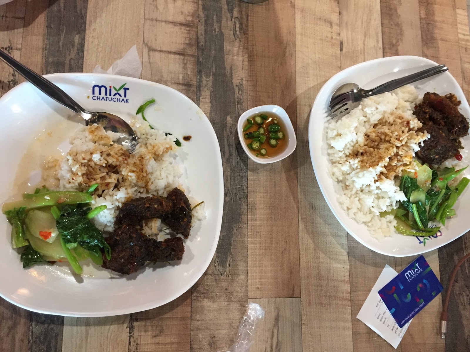 Ada dua kedai makanan halal kat food court di Chatuchak Mall. Kami makan nasi campur je. FYI, kalau nak makan kat sini kena beli kad (refundable) kat kaunter depan sebab gerai tak terima cash. Sama macam makan kat times square. Makanan not bad dan harga makanan ok la tak mahal sangat. Kalau compare kat Siem Reap mau pengsan kalau convert USD tu.